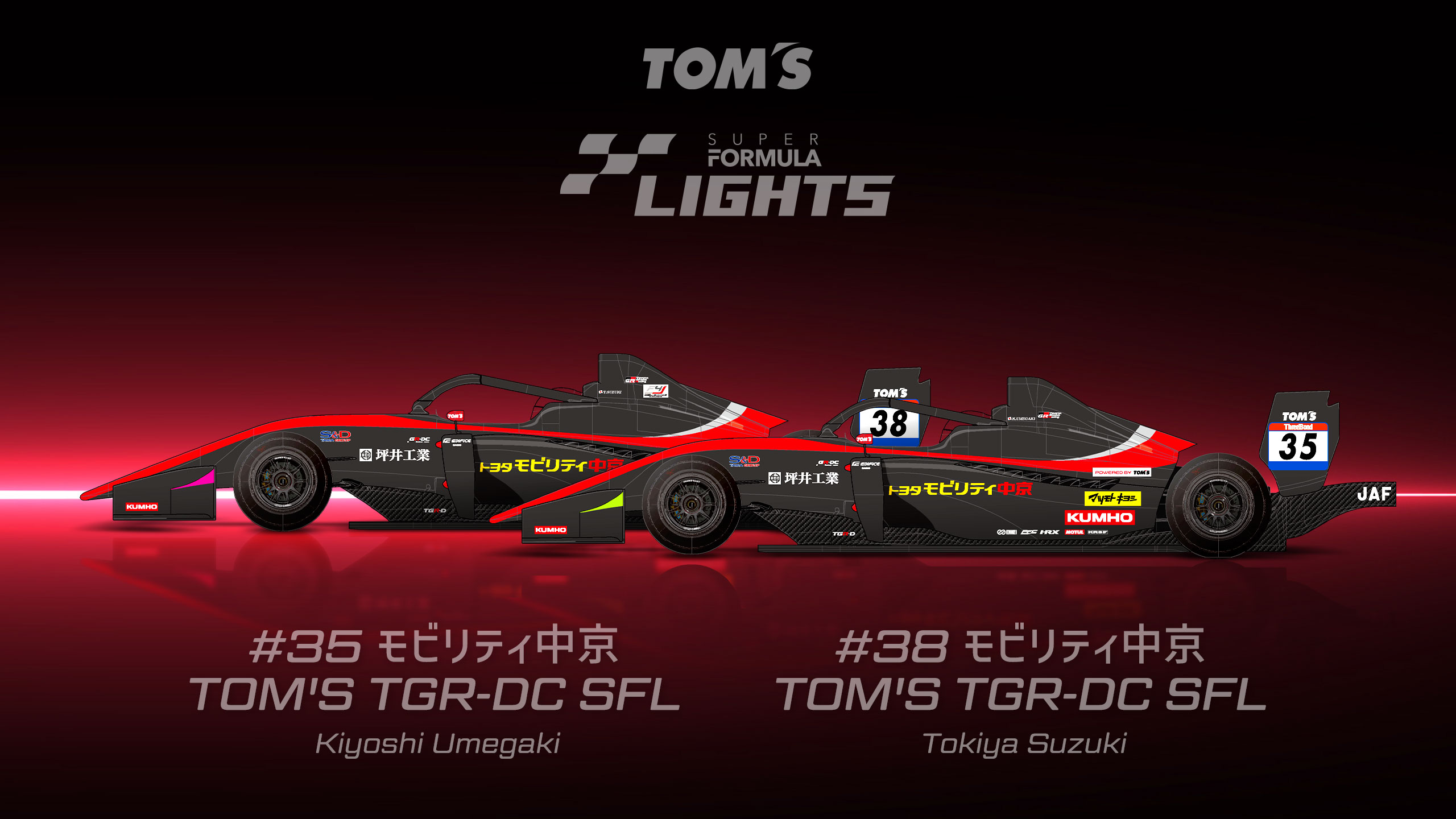 #35 モビリティ中京TOM’S TGR-DC SFL Kiyoshi Umegaki #38 モビリティ中京TOM’S TGR-DC SFL Tokiya Suzuki RACE Schedule & Report SUPER FORMULA LIGHTS 2026 第1/2/3戦レースレポート公開 DRIVER Kiyoshi Umegaki 梅垣 清 生年月日 : 2007年12月13日出身地 : 埼玉県血液型 : A型+身長 / 体重:170cm / 62kg Instagram Tokiya Suzuki 鈴⽊ ⽃輝哉 生年月日 : 2006年12月8日出身地 : 埼玉県血液型 : B型身長 / 体重:169cm / 57kg Instagram TEAM DATA チーム名 TOM’S 車両名 モビリティ中京 TOM’S TGR-DC SFL カーナンバー 35 / 38 チーム監督 山田 淳 ドライバー 梅垣 清/鈴⽊ ⽃輝哉 チーフエンジニア 吉武 聡 モビリティ中京 TOM’S TGR-DC SFL Machine coloring SPONSER
